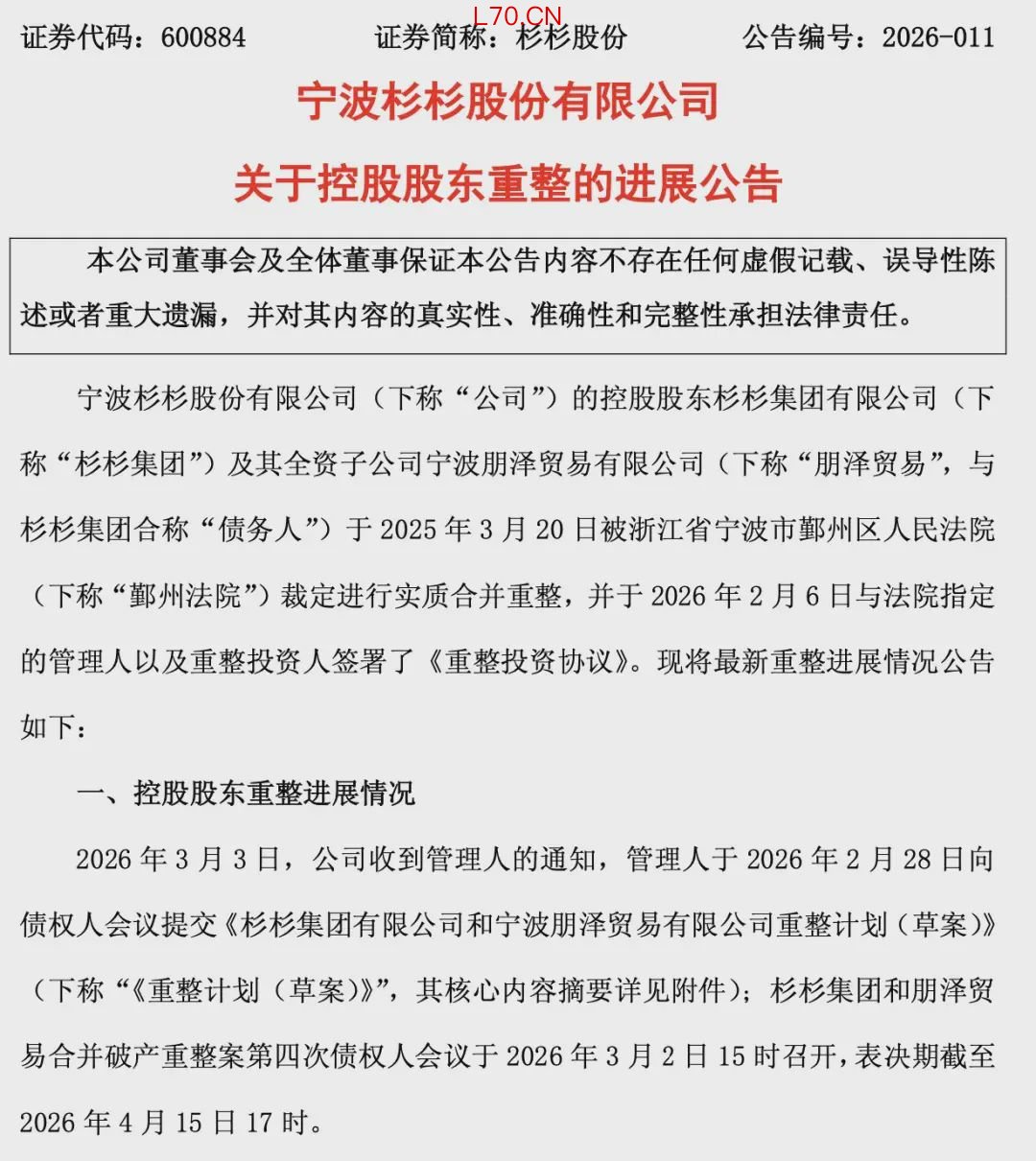 3月3日晚间,杉杉股份(维权)发布公告称,其控股股东杉杉集团有限公司及全资子公司宁波朋泽贸易有限公司的合并重整计划草案已于3月2日提交第四次债权人会议审议,表决截止日期为2026年4月15日17时。