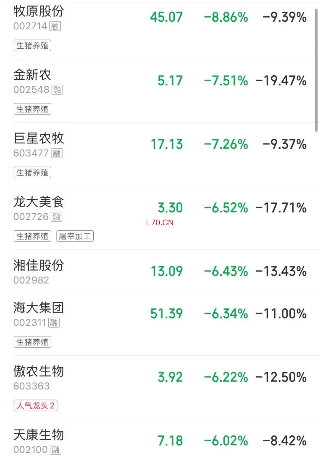 猪肉概念遭重挫,牧原股份接近跌停,金新农大跌。