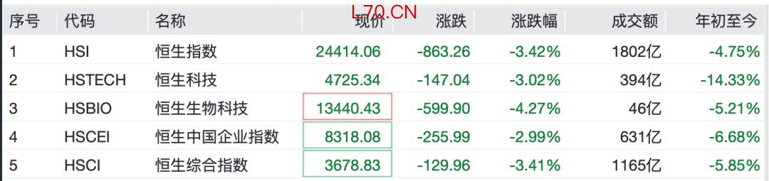 港股市场延续跌势。截至发稿,恒生指数跌3.42%,恒生科技指数跌3.02%,恒生生物科技指数跌4.27%。个股方面,哔哩哔哩、商汤、华虹半导体跌超6%,阿里巴巴、小米集团跌超3%,中芯国际跌近5%。