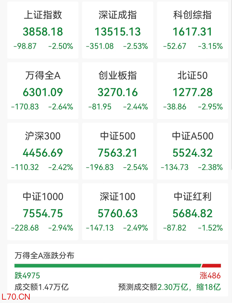 截至午间收盘,沪指跌2.5%,深成指跌2.53%,创业板指跌2.44%。