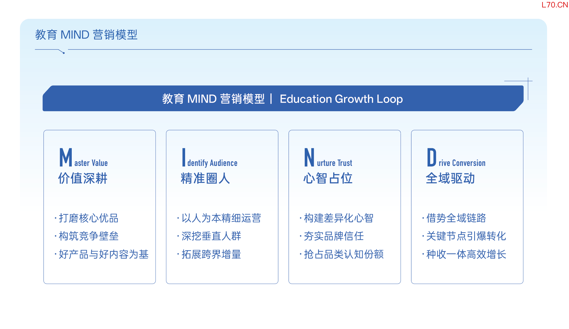 在这一背景下,白皮书提出了教育行业的MIND营销模型。这一模型立足全民学习时代下教育营销环境的变化,试图帮助教育品牌在更复杂的全域生态中,完成从流量思维到经营思维的升级。其核心不只是“怎么投放”,而是如何通过价值深耕(Master Value)、精准圈人(Identify Audience)、心智占位(Nurture Trust)、全域驱动(Drive Conversion)四个关键环节,建立从认知到转化、从流量到留量的完整增长闭环。