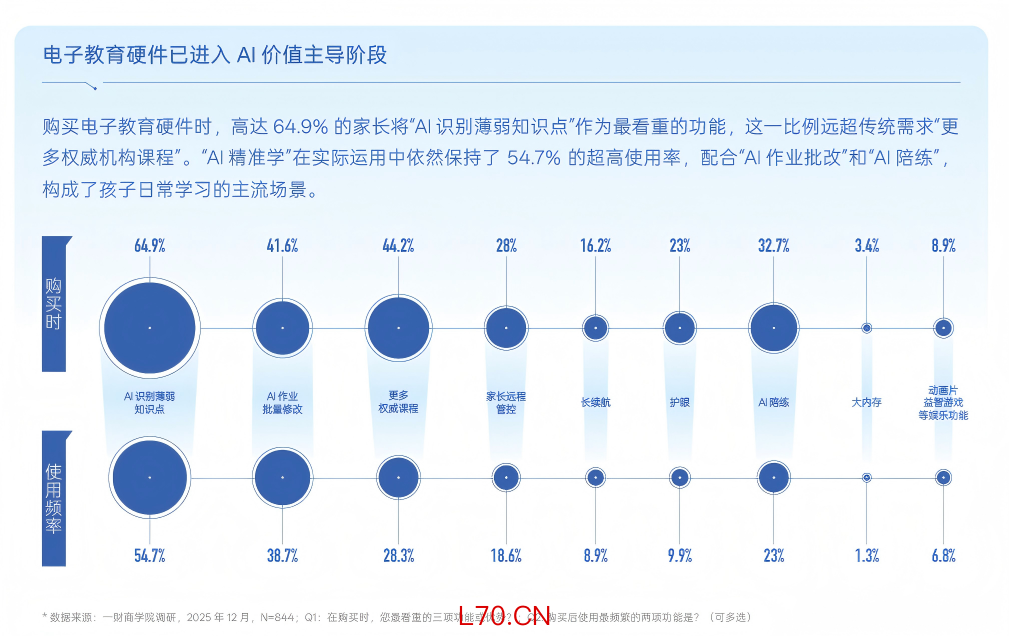 元股证券:ygzq.hk与此同时,技术能力开始更深地介入教育供给之中,从智能推荐、学习诊断,到内容匹配与进度追踪,科技正在成为支撑全新教育生态的底层基础设施。调研数据显示,在购买和实际使用中,教育电子产品中的AI功能正成为用户重点关注的核心要素。