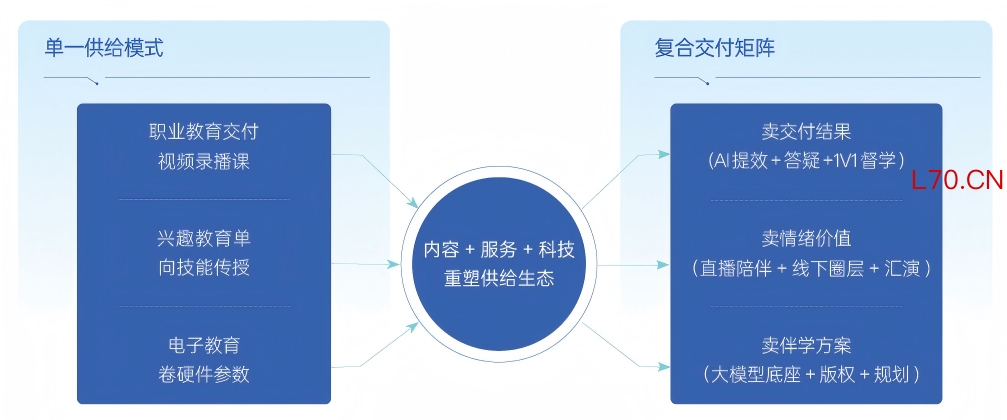 当教育需求从标准化走向高度个性化,供给方式也必然随之调整。白皮书显示,教育行业正在从以标准化课程为核心的单一供给模式,迈向“内容 + 服务 + 科技”深度融合的新供给阶段。在这一阶段,教育产品不再只是卖课程,而是围绕用户的学习目标与成长路径,提供更连续、更立体的学习支持。