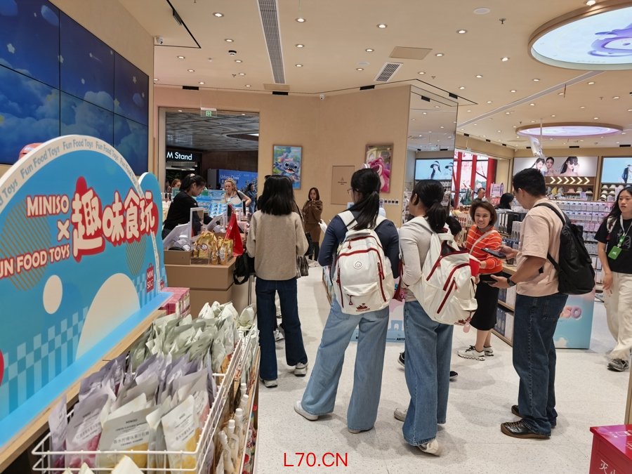 在昌化路桥上和天安千树商场内,这种国际化氛围尤其浓厚。中午时分,天安千树商场内的名创优品等店铺内的外国游客占比超过八成,他们饶有兴致地挑选卡通玩偶、美妆工具等生活小物,在收银台前排起了长队。