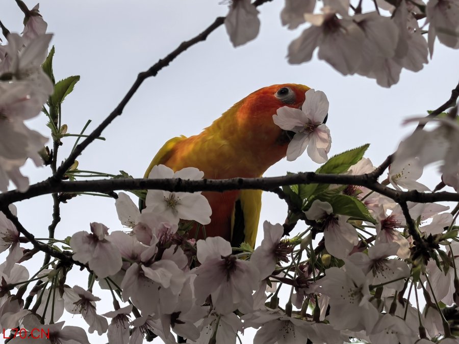 樱花树上的鹦鹉成为摄影爱好者的焦点。