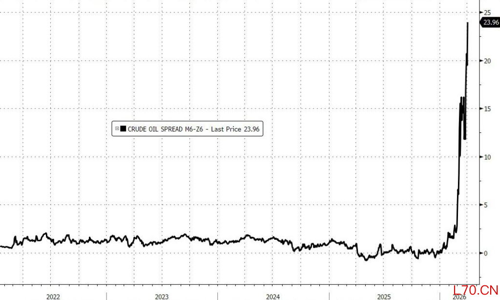 美国原油市场的紧张信号同步急剧升温。WTI原油近月价差——即最近两个到期合约之间的价格差——周四一度扩大至每桶逾16美元,为有记录以来最大溢价。