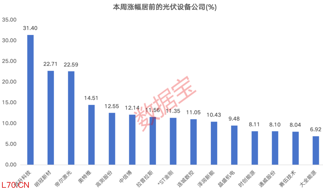 从光伏设备行业70家公司的市场表现来看,本周有10家公司股价涨幅超过10%,琏升科技、明冠新材、帝尔激光本周股价累计涨幅均超过20%。