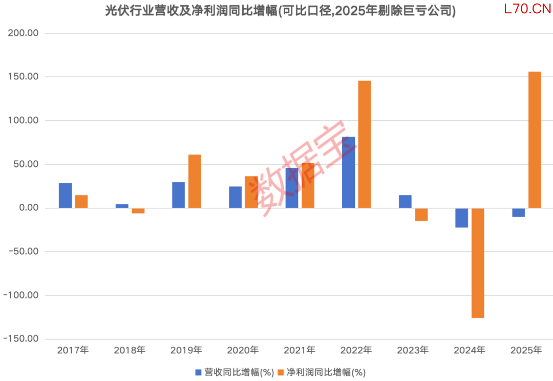 与历史数据对比发现,光伏行业2025年营收下降幅度大幅收窄,且净利润扭转持续下降或亏损的局面。