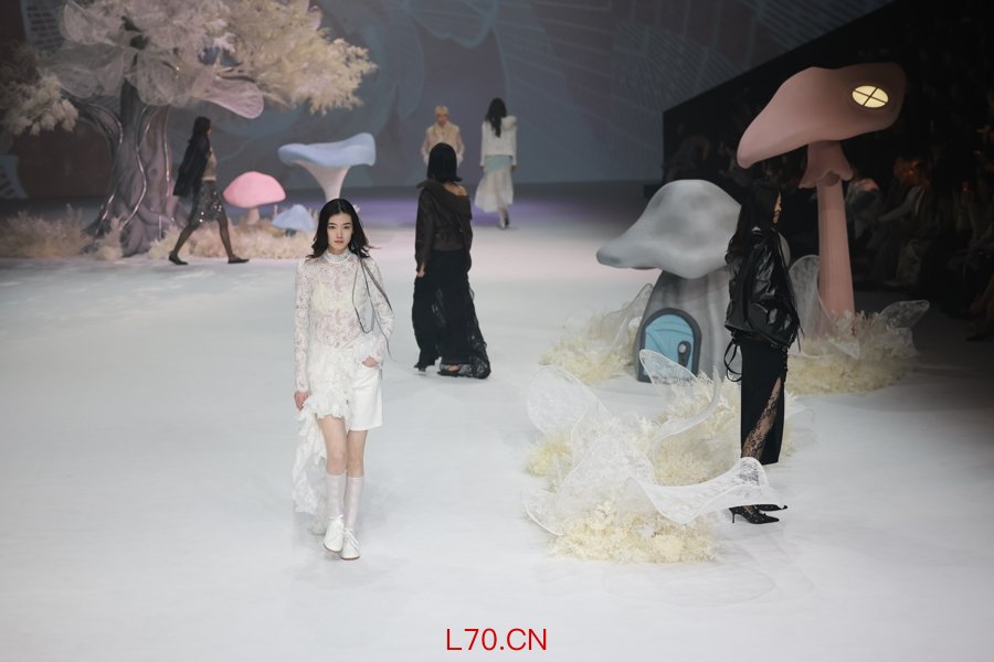 HPLY荷比俪今年首次登上上海时装周的秀场。发布秀以“成年人的童话”为叙事线索,将品牌标志性蕾丝纹样与蘑菇屋、草木等童话元素错落铺陈,为观众构筑起一座织梦奇境。品牌代言人李一桐身着HPLY荷比俪2026夏秋系列造型亮相,以“未境探梦官”身份出席本次大秀。