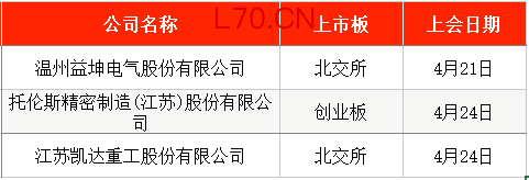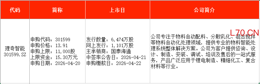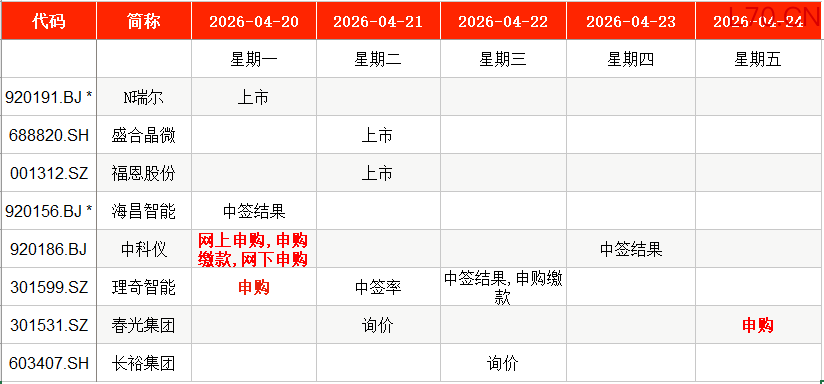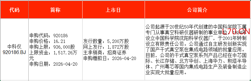 从时间表看,中科仪(920186)、理奇智能(301599)在本周一(4月20日)申购,春光集团(301531)将在本周五(4月24日)申购。