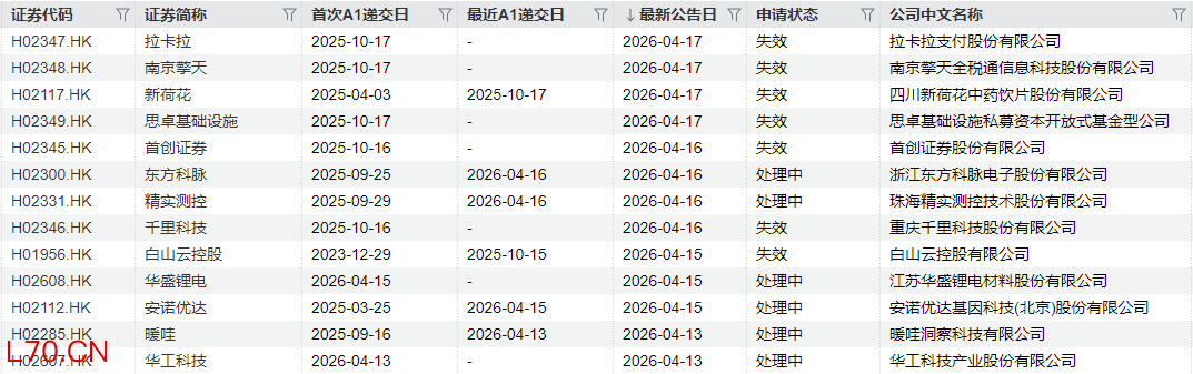 拉卡拉支付股份有限公司、南京擎天全税通信息科技股份有限公司、四川新荷花中药饮片股份有限公司等公司的港股申请失效。