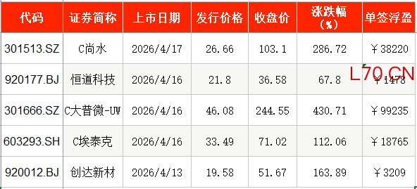 4月17日,尚水智能(301513)在北交所主板挂牌上市,发行价为26.66元/股,截至上市首日收盘,该股报103.1元/股,涨幅为286.72%。以收盘价计算,投资者中一签浮盈为3.82万元。