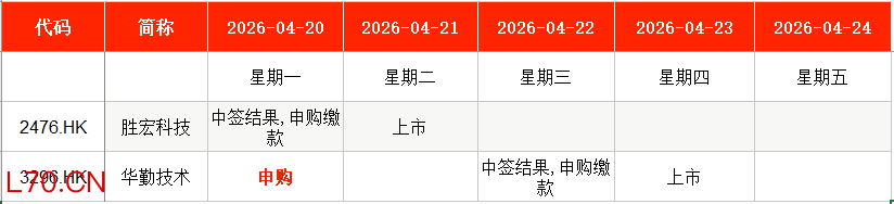 港股方面,Wind数据显示,本周(4月20日至4月24日)有1只新股安排申购。华勤技术(03296.HK)将在本周一申购。