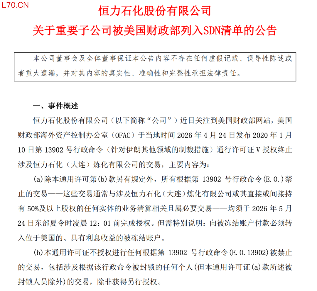 恒力石化在公告中表示,公司近日关注到美国财政部网站,美国财政部海外资产控制办公室(OFAC)于当地时间2026年4月24日发布2020年1月10日第13902号行政命令(针对伊朗其他领域的制裁措施)通行许可证V授权终止涉及恒力石化(大连)炼化有限公司的交易,主要内容为: